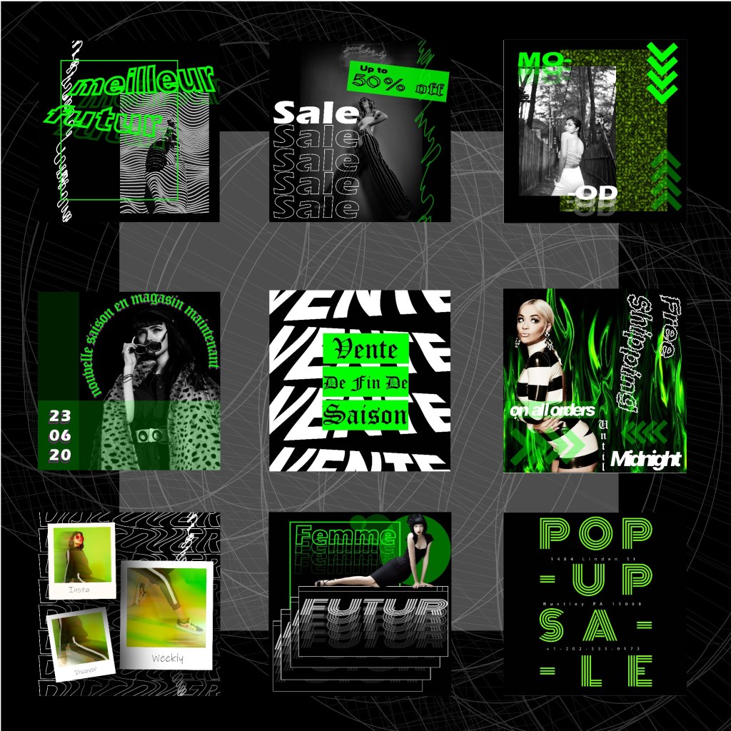 Instagram marketing package for clothing brand. Tiles for promotion purposes, adhering to colour themes and manipulating typography, taking into consideration up-to-date design trends. Made using…